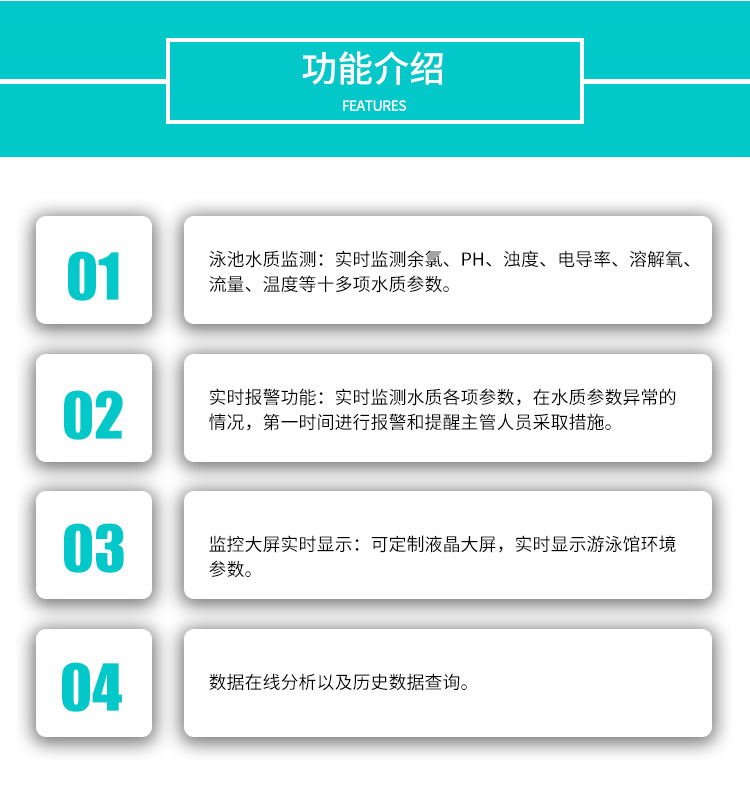 游泳池水質在線監測系統是由在線監測設備(遠程在線監測儀)與網絡監控平臺(數據中心) 組成,游泳池在線監測儀是水質監測的設備,主要功能是實時監測泳池水質余氯、pH、 溫度、濁度、0RP指標,數據自動采集、無線傳輸、云端存儲及分析處理、微信查看及預警、控制投藥、數據公示等優勢,實現泳池水質自動管理系統,維護水質達標。 游泳池水質在線監測系統能做到24小時實時監測水質重要指標,對可能發生的突發、異常情況及時給予預警,完成目前人工所不能完成的工作,不同的監測系統所監測的項目指標也有不同,游泳池在線監測儀能夠實時監測余氯、pH、濁度、溫度、0RP(氧化還原電位)等多個水質參數。